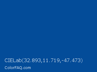 CIELab 32.893,11.719,-47.473 Color is a normal blue color and the nearest color is USAFA Blue #004f98. Hex code #034c99 and RGB value is rgb(3,76,153). In RGB color space, this color is composed of 1% red, 30% green, 60% blue, In CMYK color space, this color is composed of 98% cyan, 50% magenta, 0% yellow , 40% black , In HSL color space, this color has a hue angle of 211° , 96% saturation and 31% lightness.