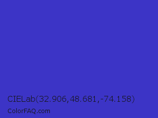 CIELab 32.906,48.681,-74.158 Color is a normal indigo color and the nearest color is Governor Bay #2f3cb3. Hex code #3c34c6 and RGB value is rgb(60,52,198). In RGB color space, this color is composed of 24% red, 20% green, 78% blue, In CMYK color space, this color is composed of 70% cyan, 74% magenta, 0% yellow , 22% black , In HSL color space, this color has a hue angle of 243° , 58% saturation and 49% lightness.