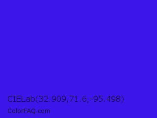 CIELab 32.909,71.6,-95.498 Color is a normal indigo color and the nearest color is Han Purple #5218fa. Hex code #3c15eb and RGB value is rgb(60,21,235). In RGB color space, this color is composed of 24% red, 8% green, 92% blue, In CMYK color space, this color is composed of 74% cyan, 91% magenta, 0% yellow , 8% black , In HSL color space, this color has a hue angle of 251° , 84% saturation and 50% lightness.