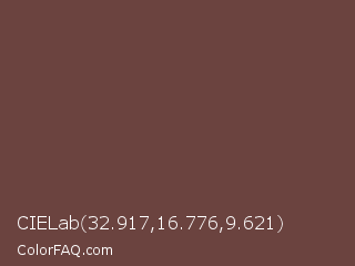 CIELab 32.917,16.776,9.621 Color is a normal red color and the nearest color is Roast Coffee #704241. Hex code #6b433f and RGB value is rgb(107,67,63). In RGB color space, this color is composed of 42% red, 26% green, 25% blue, In CMYK color space, this color is composed of 0% cyan, 37% magenta, 41% yellow , 58% black , In HSL color space, this color has a hue angle of 5° , 26% saturation and 33% lightness.