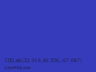 CIELab 32.919,40.356,-67.687 Color is a normal blue color and the nearest color is Governor Bay #2f3cb3. Hex code #363bbb and RGB value is rgb(54,59,187). In RGB color space, this color is composed of 21% red, 23% green, 73% blue, In CMYK color space, this color is composed of 71% cyan, 68% magenta, 0% yellow , 27% black , In HSL color space, this color has a hue angle of 238° , 55% saturation and 47% lightness.
