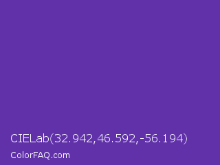 CIELab 32.942,46.592,-56.194 Color is a normal violet color and the nearest color is Grape #6f2da8. Hex code #6031a8 and RGB value is rgb(96,49,168). In RGB color space, this color is composed of 38% red, 19% green, 66% blue, In CMYK color space, this color is composed of 43% cyan, 71% magenta, 0% yellow , 34% black , In HSL color space, this color has a hue angle of 264° , 55% saturation and 43% lightness.