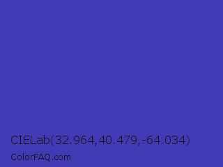 CIELab 32.964,40.479,-64.034 Color is a normal indigo color and the nearest color is Ocean Blue #4f42b5. Hex code #423ab5 and RGB value is rgb(66,58,181). In RGB color space, this color is composed of 26% red, 23% green, 71% blue, In CMYK color space, this color is composed of 64% cyan, 68% magenta, 0% yellow , 29% black , In HSL color space, this color has a hue angle of 244° , 51% saturation and 47% lightness.