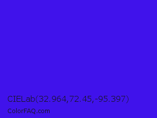 CIELab 32.964,72.45,-95.397 Color is a normal indigo color and the nearest color is Han Purple #5218fa. Hex code #4012eb and RGB value is rgb(64,18,235). In RGB color space, this color is composed of 25% red, 7% green, 92% blue, In CMYK color space, this color is composed of 73% cyan, 92% magenta, 0% yellow , 8% black , In HSL color space, this color has a hue angle of 253° , 86% saturation and 50% lightness.