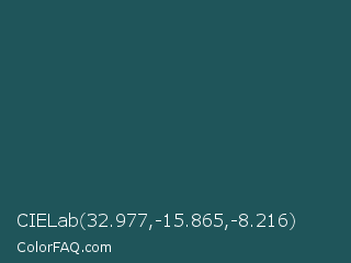 CIELab 32.977,-15.865,-8.216 Color is a dark cyan color and the nearest color is Blue Dianne #204852. Hex code #1f555a and RGB value is rgb(31,85,90). In RGB color space, this color is composed of 12% red, 33% green, 35% blue, In CMYK color space, this color is composed of 66% cyan, 6% magenta, 0% yellow , 65% black , In HSL color space, this color has a hue angle of 185° , 49% saturation and 24% lightness.