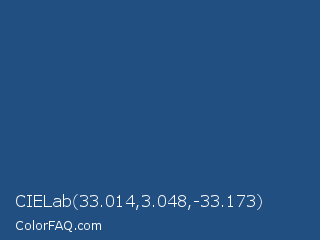 CIELab 33.014,3.048,-33.173 Color is a normal blue color and the nearest color is Chathams Blue #175579. Hex code #224f82 and RGB value is rgb(34,79,130). In RGB color space, this color is composed of 13% red, 31% green, 51% blue, In CMYK color space, this color is composed of 74% cyan, 39% magenta, 0% yellow , 49% black , In HSL color space, this color has a hue angle of 212° , 59% saturation and 32% lightness.