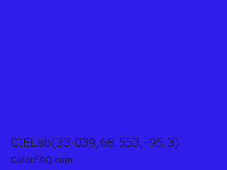 CIELab 33.039,68.553,-95.3 Color is a normal indigo color and the nearest color is Bluebonnet #1c1cf0. Hex code #301eeb and RGB value is rgb(48,30,235). In RGB color space, this color is composed of 19% red, 12% green, 92% blue, In CMYK color space, this color is composed of 80% cyan, 87% magenta, 0% yellow , 8% black , In HSL color space, this color has a hue angle of 245° , 84% saturation and 52% lightness.