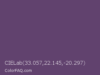 CIELab 33.057,22.145,-20.297 Color is a normal purple color and the nearest color is Cyber Grape #58427c. Hex code #61426e and RGB value is rgb(97,66,110). In RGB color space, this color is composed of 38% red, 26% green, 43% blue, In CMYK color space, this color is composed of 12% cyan, 40% magenta, 0% yellow , 57% black , In HSL color space, this color has a hue angle of 282° , 25% saturation and 35% lightness.