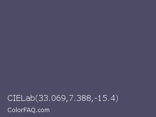 CIELab 33.069,7.388,-15.4 Color is a normal indigo color and the nearest color is Mulled Wine #4e4562. Hex code #4d4b66 and RGB value is rgb(77,75,102). In RGB color space, this color is composed of 30% red, 29% green, 40% blue, In CMYK color space, this color is composed of 25% cyan, 26% magenta, 0% yellow , 60% black , In HSL color space, this color has a hue angle of 244° , 15% saturation and 35% lightness.