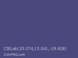 CIELab 33.074,15.041,-29.828 Color is a normal indigo color and the nearest color is East Bay #414c7d. Hex code #4a487d and RGB value is rgb(74,72,125). In RGB color space, this color is composed of 29% red, 28% green, 49% blue, In CMYK color space, this color is composed of 41% cyan, 42% magenta, 0% yellow , 51% black , In HSL color space, this color has a hue angle of 242° , 27% saturation and 39% lightness.