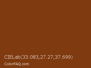 CIELab 33.083,27.27,37.699 Color is a dark orange color and the nearest color is Copper Canyon #7e3a15. Hex code #7f3a10 and RGB value is rgb(127,58,16). In RGB color space, this color is composed of 50% red, 23% green, 6% blue, In CMYK color space, this color is composed of 0% cyan, 54% magenta, 87% yellow , 50% black , In HSL color space, this color has a hue angle of 23° , 78% saturation and 28% lightness.