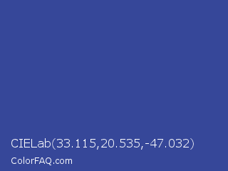 CIELab 33.115,20.535,-47.032 Color is a normal blue color and the nearest color is Sapphire #2f519e. Hex code #364799 and RGB value is rgb(54,71,153). In RGB color space, this color is composed of 21% red, 28% green, 60% blue, In CMYK color space, this color is composed of 65% cyan, 54% magenta, 0% yellow , 40% black , In HSL color space, this color has a hue angle of 230° , 48% saturation and 41% lightness.