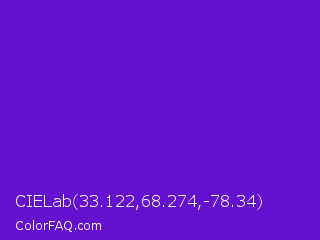CIELab 33.122,68.274,-78.34 Color is a normal violet color and the nearest color is Purple Heart Crayola #652dc1. Hex code #6510ce and RGB value is rgb(101,16,206). In RGB color space, this color is composed of 40% red, 6% green, 81% blue, In CMYK color space, this color is composed of 51% cyan, 92% magenta, 0% yellow , 19% black , In HSL color space, this color has a hue angle of 267° , 86% saturation and 44% lightness.