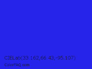CIELab 33.162,66.43,-95.107 Color is a normal indigo color and the nearest color is Bluebonnet #1c1cf0. Hex code #2623eb and RGB value is rgb(38,35,235). In RGB color space, this color is composed of 15% red, 14% green, 92% blue, In CMYK color space, this color is composed of 84% cyan, 85% magenta, 0% yellow , 8% black , In HSL color space, this color has a hue angle of 241° , 83% saturation and 53% lightness.
