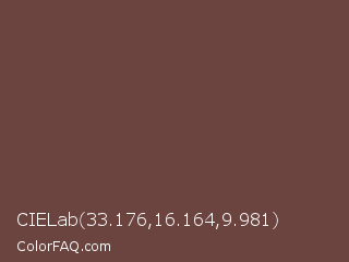 CIELab 33.176,16.164,9.981 Color is a normal red color and the nearest color is Roast Coffee #704241. Hex code #6b443f and RGB value is rgb(107,68,63). In RGB color space, this color is composed of 42% red, 27% green, 25% blue, In CMYK color space, this color is composed of 0% cyan, 36% magenta, 41% yellow , 58% black , In HSL color space, this color has a hue angle of 7° , 26% saturation and 33% lightness.