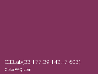 CIELab 33.177,39.142,-7.603 Color is a normal rose color and the nearest color is Boysenberry #873260. Hex code #81315b and RGB value is rgb(129,49,91). In RGB color space, this color is composed of 51% red, 19% green, 36% blue, In CMYK color space, this color is composed of 0% cyan, 62% magenta, 29% yellow , 49% black , In HSL color space, this color has a hue angle of 329° , 45% saturation and 35% lightness.