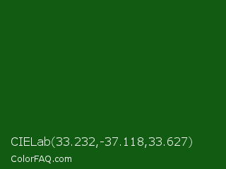 CIELab 33.232,-37.118,33.627 Color is a very dark green color and the nearest color is Parsley #134f19. Hex code #115b12 and RGB value is rgb(17,91,18). In RGB color space, this color is composed of 7% red, 36% green, 7% blue, In CMYK color space, this color is composed of 81% cyan, 0% magenta, 80% yellow , 64% black , In HSL color space, this color has a hue angle of 121° , 69% saturation and 21% lightness.