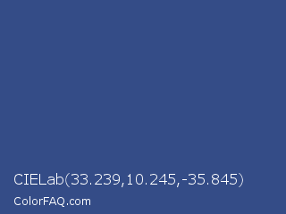 CIELab 33.239,10.245,-35.845 Color is a normal blue color and the nearest color is Chambray #354e8c. Hex code #344c87 and RGB value is rgb(52,76,135). In RGB color space, this color is composed of 20% red, 30% green, 53% blue, In CMYK color space, this color is composed of 61% cyan, 44% magenta, 0% yellow , 47% black , In HSL color space, this color has a hue angle of 223° , 44% saturation and 37% lightness.