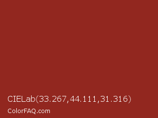 CIELab 33.267,44.111,31.316 Color is a normal red color and the nearest color is Vivid Auburn #922724. Hex code #92271f and RGB value is rgb(146,39,31). In RGB color space, this color is composed of 57% red, 15% green, 12% blue, In CMYK color space, this color is composed of 0% cyan, 73% magenta, 79% yellow , 43% black , In HSL color space, this color has a hue angle of 4° , 65% saturation and 35% lightness.