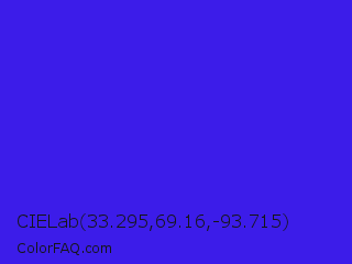 CIELab 33.295,69.16,-93.715 Color is a normal indigo color and the nearest color is Han Purple #5218fa. Hex code #3c1ce9 and RGB value is rgb(60,28,233). In RGB color space, this color is composed of 24% red, 11% green, 91% blue, In CMYK color space, this color is composed of 74% cyan, 88% magenta, 0% yellow , 9% black , In HSL color space, this color has a hue angle of 249° , 82% saturation and 51% lightness.