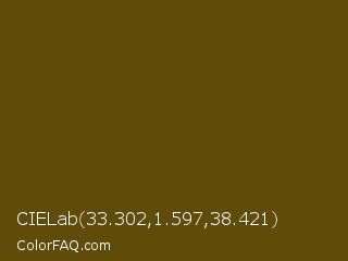 CIELab 33.302,1.597,38.421 Color is a very dark yellow color and the nearest color is Horses Neck #604913. Hex code #604c0a and RGB value is rgb(96,76,10). In RGB color space, this color is composed of 38% red, 30% green, 4% blue, In CMYK color space, this color is composed of 0% cyan, 21% magenta, 90% yellow , 62% black , In HSL color space, this color has a hue angle of 46° , 81% saturation and 21% lightness.
