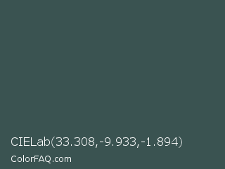 CIELab 33.308,-9.933,-1.894 Color is a dark cyan color and the nearest color is Limed Spruce #394851. Hex code #3a5351 and RGB value is rgb(58,83,81). In RGB color space, this color is composed of 23% red, 33% green, 32% blue, In CMYK color space, this color is composed of 30% cyan, 0% magenta, 2% yellow , 67% black , In HSL color space, this color has a hue angle of 175° , 18% saturation and 28% lightness.