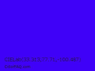 CIELab 33.313,77.71,-100.487 Color is a normal indigo color and the nearest color is Electric Ultramarine #3f00ff. Hex code #4000f5 and RGB value is rgb(64,0,245). In RGB color space, this color is composed of 25% red, 0% green, 96% blue, In CMYK color space, this color is composed of 74% cyan, 100% magenta, 0% yellow , 4% black , In HSL color space, this color has a hue angle of 256° , 100% saturation and 48% lightness.