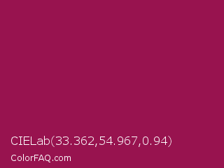 CIELab 33.362,54.967,0.94 Color is a normal rose color and the nearest color is Disco #871550. Hex code #98134f and RGB value is rgb(152,19,79). In RGB color space, this color is composed of 60% red, 7% green, 31% blue, In CMYK color space, this color is composed of 0% cyan, 88% magenta, 48% yellow , 40% black , In HSL color space, this color has a hue angle of 333° , 78% saturation and 34% lightness.
