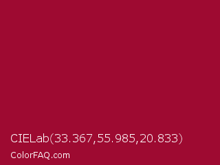 CIELab 33.367,55.985,20.833 Color is a normal rose color and the nearest color is Pink Raspberry #980036. Hex code #9e0a31 and RGB value is rgb(158,10,49). In RGB color space, this color is composed of 62% red, 4% green, 19% blue, In CMYK color space, this color is composed of 0% cyan, 94% magenta, 69% yellow , 38% black , In HSL color space, this color has a hue angle of 344° , 88% saturation and 33% lightness.