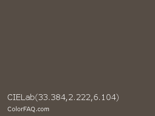CIELab 33.384,2.222,6.104 Color is a dark orange color and the nearest color is Emperor #514649. Hex code #564d45 and RGB value is rgb(86,77,69). In RGB color space, this color is composed of 34% red, 30% green, 27% blue, In CMYK color space, this color is composed of 0% cyan, 10% magenta, 20% yellow , 66% black , In HSL color space, this color has a hue angle of 28° , 11% saturation and 30% lightness.