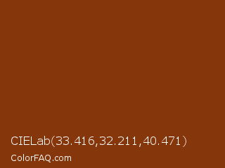 CIELab 33.416,32.211,40.471 Color is a dark orange color and the nearest color is Peru Tan #7f3a02. Hex code #86360b and RGB value is rgb(134,54,11). In RGB color space, this color is composed of 53% red, 21% green, 4% blue, In CMYK color space, this color is composed of 0% cyan, 60% magenta, 92% yellow , 47% black , In HSL color space, this color has a hue angle of 21° , 85% saturation and 28% lightness.