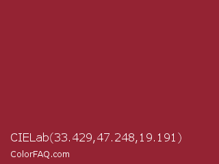 CIELab 33.429,47.248,19.191 Color is a normal red color and the nearest color is Japanese Carmine #9d2933. Hex code #942333 and RGB value is rgb(148,35,51). In RGB color space, this color is composed of 58% red, 14% green, 20% blue, In CMYK color space, this color is composed of 0% cyan, 76% magenta, 66% yellow , 42% black , In HSL color space, this color has a hue angle of 352° , 62% saturation and 36% lightness.