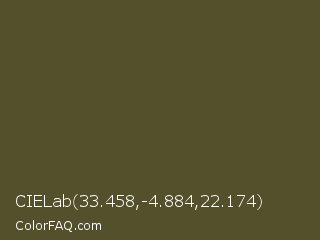 CIELab 33.458,-4.884,22.174 Color is a dark yellow color and the nearest color is Woodland #4d5328. Hex code #53502b and RGB value is rgb(83,80,43). In RGB color space, this color is composed of 33% red, 31% green, 17% blue, In CMYK color space, this color is composed of 0% cyan, 4% magenta, 48% yellow , 67% black , In HSL color space, this color has a hue angle of 56° , 32% saturation and 25% lightness.