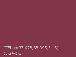 CIELab 33.478,35.095,5.13 Color is a normal red color and the nearest color is Solid Pink #893843. Hex code #823548 and RGB value is rgb(130,53,72). In RGB color space, this color is composed of 51% red, 21% green, 28% blue, In CMYK color space, this color is composed of 0% cyan, 59% magenta, 45% yellow , 49% black , In HSL color space, this color has a hue angle of 345° , 42% saturation and 36% lightness.