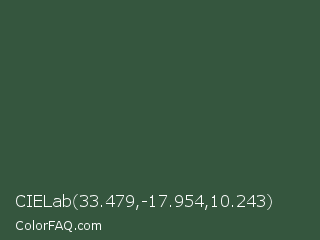 CIELab 33.479,-17.954,10.243 Color is a dark green color and the nearest color is Hunter Green #355e3b. Hex code #35563e and RGB value is rgb(53,86,62). In RGB color space, this color is composed of 21% red, 34% green, 24% blue, In CMYK color space, this color is composed of 38% cyan, 0% magenta, 28% yellow , 66% black , In HSL color space, this color has a hue angle of 136° , 24% saturation and 27% lightness.