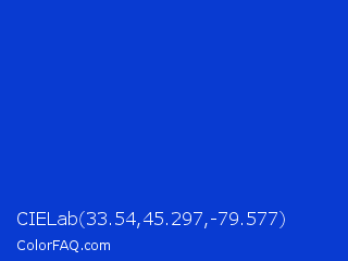 CIELab 33.54,45.297,-79.577 Color is a normal blue color and the nearest color is Absolute Zero #0048ba. Hex code #093bd1 and RGB value is rgb(9,59,209). In RGB color space, this color is composed of 4% red, 23% green, 82% blue, In CMYK color space, this color is composed of 96% cyan, 72% magenta, 0% yellow , 18% black , In HSL color space, this color has a hue angle of 225° , 92% saturation and 43% lightness.