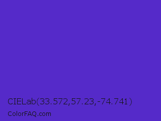 CIELab 33.572,57.23,-74.741 Color is a normal indigo color and the nearest color is Purple Heart Crayola #652dc1. Hex code #552ac9 and RGB value is rgb(85,42,201). In RGB color space, this color is composed of 33% red, 16% green, 79% blue, In CMYK color space, this color is composed of 58% cyan, 79% magenta, 0% yellow , 21% black , In HSL color space, this color has a hue angle of 256° , 65% saturation and 48% lightness.