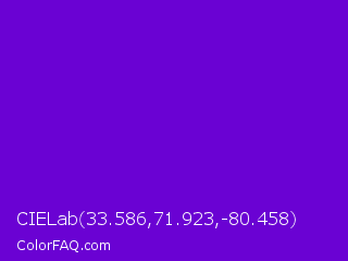 CIELab 33.586,71.923,-80.458 Color is a normal violet color and the nearest color is French Violet #8806ce. Hex code #6a02d3 and RGB value is rgb(106,2,211). In RGB color space, this color is composed of 42% red, 1% green, 83% blue, In CMYK color space, this color is composed of 50% cyan, 99% magenta, 0% yellow , 17% black , In HSL color space, this color has a hue angle of 270° , 98% saturation and 42% lightness.