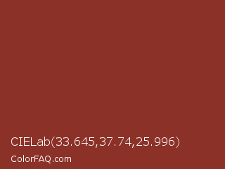 CIELab 33.645,37.74,25.996 Color is a normal red color and the nearest color is Burnt Umber #8a3324. Hex code #8b3128 and RGB value is rgb(139,49,40). In RGB color space, this color is composed of 55% red, 19% green, 16% blue, In CMYK color space, this color is composed of 0% cyan, 65% magenta, 71% yellow , 45% black , In HSL color space, this color has a hue angle of 5° , 55% saturation and 35% lightness.