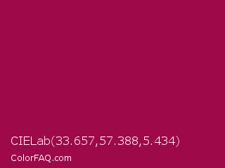 CIELab 33.657,57.388,5.434 Color is a normal rose color and the nearest color is Pink Raspberry #980036. Hex code #9d0949 and RGB value is rgb(157,9,73). In RGB color space, this color is composed of 62% red, 4% green, 29% blue, In CMYK color space, this color is composed of 0% cyan, 94% magenta, 54% yellow , 38% black , In HSL color space, this color has a hue angle of 334° , 89% saturation and 33% lightness.