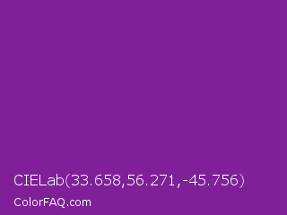 CIELab 33.658,56.271,-45.756 Color is a normal purple color and the nearest color is Seance #731e8f. Hex code #7f2099 and RGB value is rgb(127,32,153). In RGB color space, this color is composed of 50% red, 13% green, 60% blue, In CMYK color space, this color is composed of 17% cyan, 79% magenta, 0% yellow , 40% black , In HSL color space, this color has a hue angle of 287° , 65% saturation and 36% lightness.