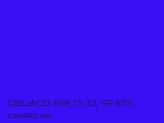 CIELab 33.698,75.32,-99.853 Color is a normal indigo color and the nearest color is Electric Ultramarine #3f00ff. Hex code #3b0ff5 and RGB value is rgb(59,15,245). In RGB color space, this color is composed of 23% red, 6% green, 96% blue, In CMYK color space, this color is composed of 76% cyan, 94% magenta, 0% yellow , 4% black , In HSL color space, this color has a hue angle of 251° , 92% saturation and 51% lightness.