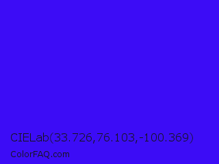 CIELab 33.726,76.103,-100.369 Color is a normal indigo color and the nearest color is Electric Ultramarine #3f00ff. Hex code #3c0cf6 and RGB value is rgb(60,12,246). In RGB color space, this color is composed of 24% red, 5% green, 96% blue, In CMYK color space, this color is composed of 76% cyan, 95% magenta, 0% yellow , 4% black , In HSL color space, this color has a hue angle of 252° , 93% saturation and 51% lightness.