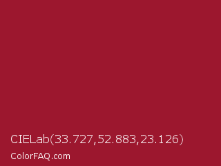 CIELab 33.727,52.883,23.126 Color is a normal red color and the nearest color is Vivid Burgundy #9f1d35. Hex code #9c172e and RGB value is rgb(156,23,46). In RGB color space, this color is composed of 61% red, 9% green, 18% blue, In CMYK color space, this color is composed of 0% cyan, 85% magenta, 71% yellow , 39% black , In HSL color space, this color has a hue angle of 350° , 74% saturation and 35% lightness.