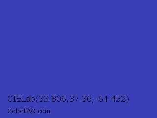 CIELab 33.806,37.36,-64.452 Color is a normal blue color and the nearest color is Governor Bay #2f3cb3. Hex code #3a3fb8 and RGB value is rgb(58,63,184). In RGB color space, this color is composed of 23% red, 25% green, 72% blue, In CMYK color space, this color is composed of 68% cyan, 66% magenta, 0% yellow , 28% black , In HSL color space, this color has a hue angle of 238° , 52% saturation and 47% lightness.