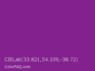 CIELab 33.821,54.339,-38.72 Color is a normal magenta color and the nearest color is Seance #731e8f. Hex code #83228e and RGB value is rgb(131,34,142). In RGB color space, this color is composed of 51% red, 13% green, 56% blue, In CMYK color space, this color is composed of 8% cyan, 76% magenta, 0% yellow , 44% black , In HSL color space, this color has a hue angle of 294° , 61% saturation and 35% lightness.