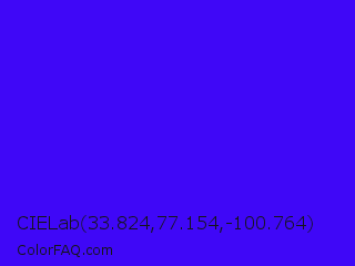 CIELab 33.824,77.154,-100.764 Color is a normal indigo color and the nearest color is Electric Ultramarine #3f00ff. Hex code #3f07f7 and RGB value is rgb(63,7,247). In RGB color space, this color is composed of 25% red, 3% green, 97% blue, In CMYK color space, this color is composed of 74% cyan, 97% magenta, 0% yellow , 3% black , In HSL color space, this color has a hue angle of 254° , 94% saturation and 50% lightness.