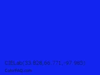 CIELab 33.828,66.771,-97.985 Color is a normal blue color and the nearest color is Bluebonnet #1c1cf0. Hex code #1226f2 and RGB value is rgb(18,38,242). In RGB color space, this color is composed of 7% red, 15% green, 95% blue, In CMYK color space, this color is composed of 93% cyan, 84% magenta, 0% yellow , 5% black , In HSL color space, this color has a hue angle of 235° , 90% saturation and 51% lightness.