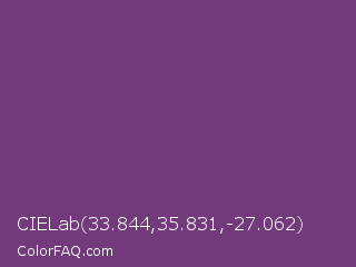 CIELab 33.844,35.831,-27.062 Color is a normal magenta color and the nearest color is Maximum Purple #733380. Hex code #72397b and RGB value is rgb(114,57,123). In RGB color space, this color is composed of 45% red, 22% green, 48% blue, In CMYK color space, this color is composed of 7% cyan, 54% magenta, 0% yellow , 52% black , In HSL color space, this color has a hue angle of 292° , 37% saturation and 35% lightness.