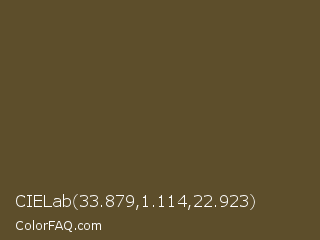 CIELab 33.879,1.114,22.923 Color is a dark orange color and the nearest color is Donkey Brown #664c28. Hex code #5d4e2b and RGB value is rgb(93,78,43). In RGB color space, this color is composed of 36% red, 31% green, 17% blue, In CMYK color space, this color is composed of 0% cyan, 16% magenta, 54% yellow , 64% black , In HSL color space, this color has a hue angle of 42° , 37% saturation and 27% lightness.